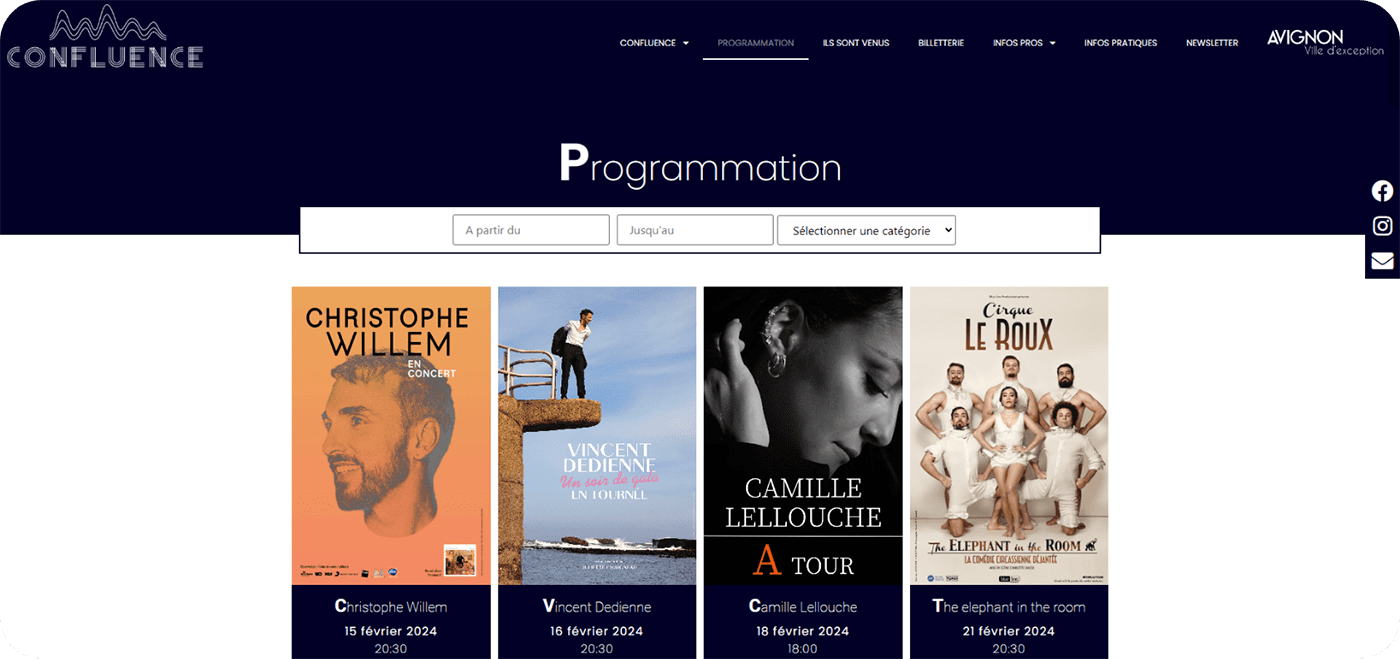 Le site internet principalement orienté autour de la programmation de spectacles. C’est d’ailleurs la première fonction de ce site. Cette programmation est divisée en différentes catégories selon le type de spectacle proposé, tels que les concerts, les one-man shows, et bien d’autres. Les spectacles peuvent également être filtrés par date pour une meilleure expérience des visiteurs.